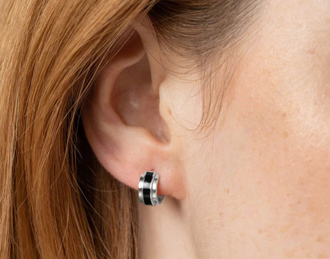 Lately, the earrings I wear most often are the Enamel Stripe Huggie Earrings – Silver/Black, thanks to their versatile design that complements my daily outfits.